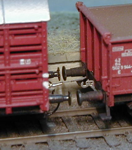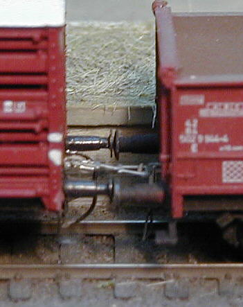 The buffers are touching as the pushing is over the buffers. The coupling is not strained and moved backwards in its elongated hole. The small indent in the hook prevents the coupling from working its way toward the top and falling out. The coupling is matched for the use with standard continental buffers of 4 mm length.