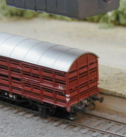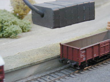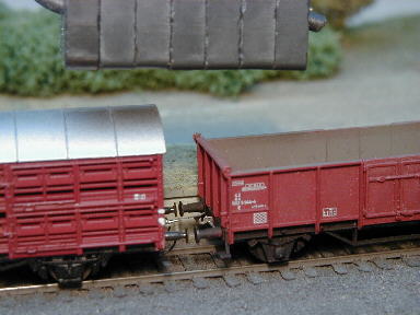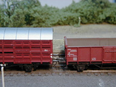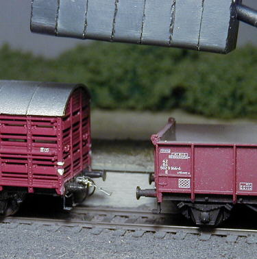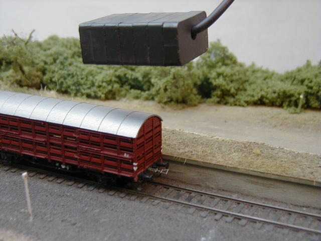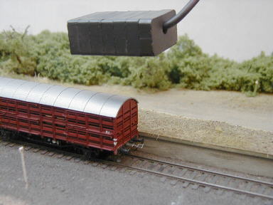 Here we see how we position the magnet above an open wagon. The magnet is about halfway over the coupling and the coupling is repelled and in underslung position. We keep the magnet in this position and then move the cattle wagon toward the open wagon.