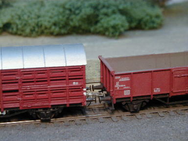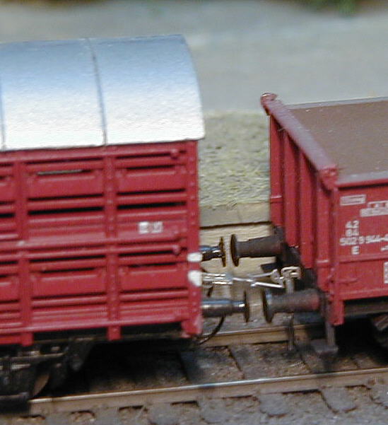 Here we are coupled up and can either move out or go on pushing two wagons coupled as shown in the next photo. Note that only 1 coupling of a pair is used, the one on the open wagon is hanging down. Smarties might think that they only need 1 coupling per wagon but note that screwcoupling part is bearing in the hook thus you need at least 2 hooks on either side and therefore might fit the other screwcoupling as well.