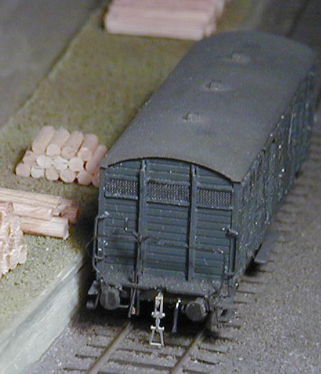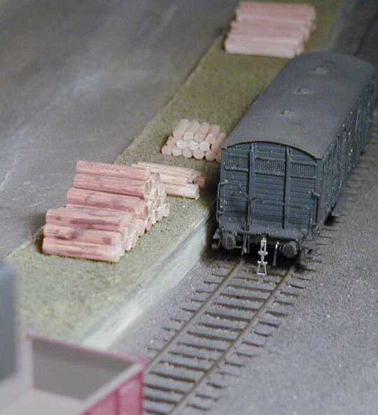 The wagons are standing on Bovigny, a Fremo module depicting a wood loading dock, halfway on the line connecting Luik and Gouvy in Belgium, . The cruel enlargement even shows the tiniest dust particles. Track is code 40 from Micro Engineering, USA.