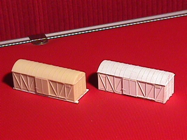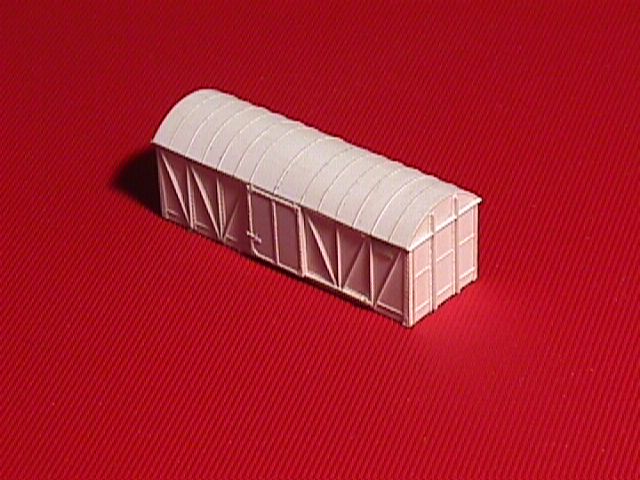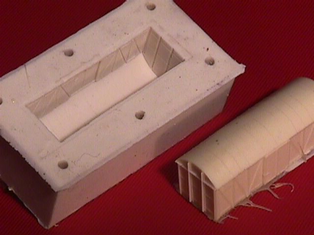 More difficult is the Belgian Gkkms , a closed wagon. In real life built in 1946/47 with profiles folded from sheetmetal. The roof is curved as described in the plastic section. In principle first glue a square box with 2 inside reinforcements for strength, then glue the roof on top and trim the oversize roof. After that glue all strips in place. The nails were individually pressed into the sheet with a sharp pin every mm. In this case the wagon is open at the underside. The sides, solebars and bufferbeams are in one piece because they were in the same plane. On the foto's you can see that I used the original model to make mould with 2 component silicone rubber. In fact it is a double mould existing of an inside and outside form. The foto's only show the outer mould together with a casted copy made in it using 2 component polyurethane. Depending on the number of fine details you can use such a mould upto 50 times to make a copy. Your mould will gradually deteriorate, which means that sometimes pieces of details wil tear off when you take out your casting. The mould is made by taping the model into a box made to size, leaving about 1 cm clear on all sides. After that silicon rubber is mixed and poured in the box. After 8-24 hours you can take your original out again. Of course you cannot make a complete model in it. You still have to finish each individual model with handrails, steps and such undercut details you cannot cast. But each raw casting takes only about 15 min to retrieve the state of the original which took 3 evenings to produce. I regularly use this copying technique to take shortcuts. For instance on Spaubeke the frontwall of the station is copy of the backwall. Saving some 300 individual cut pieces of plastic. In this case the mould is used only once but the timesaving was enormous making more than good the cost of silicone and casting materials. But you can use it to copy springs and axlebearings for your own models. Or to cast extra ventilators on roofs of diesels. Or built one diesel masterfront and cast two equal copies. Or use it to repair things. For instance a broken body by making a copy of the intact front. Another use is to make a backup of your work. If are working on a difficult model and the next operation has high risk of spoiling your work then first make a mould to preserve your work. Silicone rubber is expensive, about 30 euro a kg. The price of PU is even higher. Minimum quantities are often 1 or even 2 kg. Instead of PU you can also use epoxy or materials such as gipsum, or other stonecast materials, all depending on the object.
