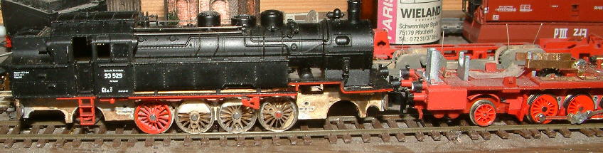 Hier ein erstes Bild von meinem BR93 Projekt. Die Arnold Lok bekommt ein neues Fahrwerk mit neu angefertigten Rädern, die den richtigen Durchmesser haben. Das neue Fahrwerk hat Ausgleichshebel für eine gute Stromabnahme und Führung im Gleis bei niederigen Spurkränzen. Das neue Getriebe ist stärker untersetzt.