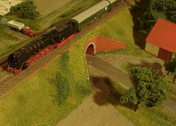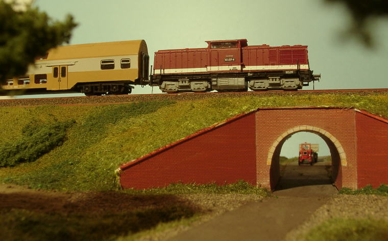 Eine Brawa V100 mit Doppelstockwagen (Bausatz: Schlosser)